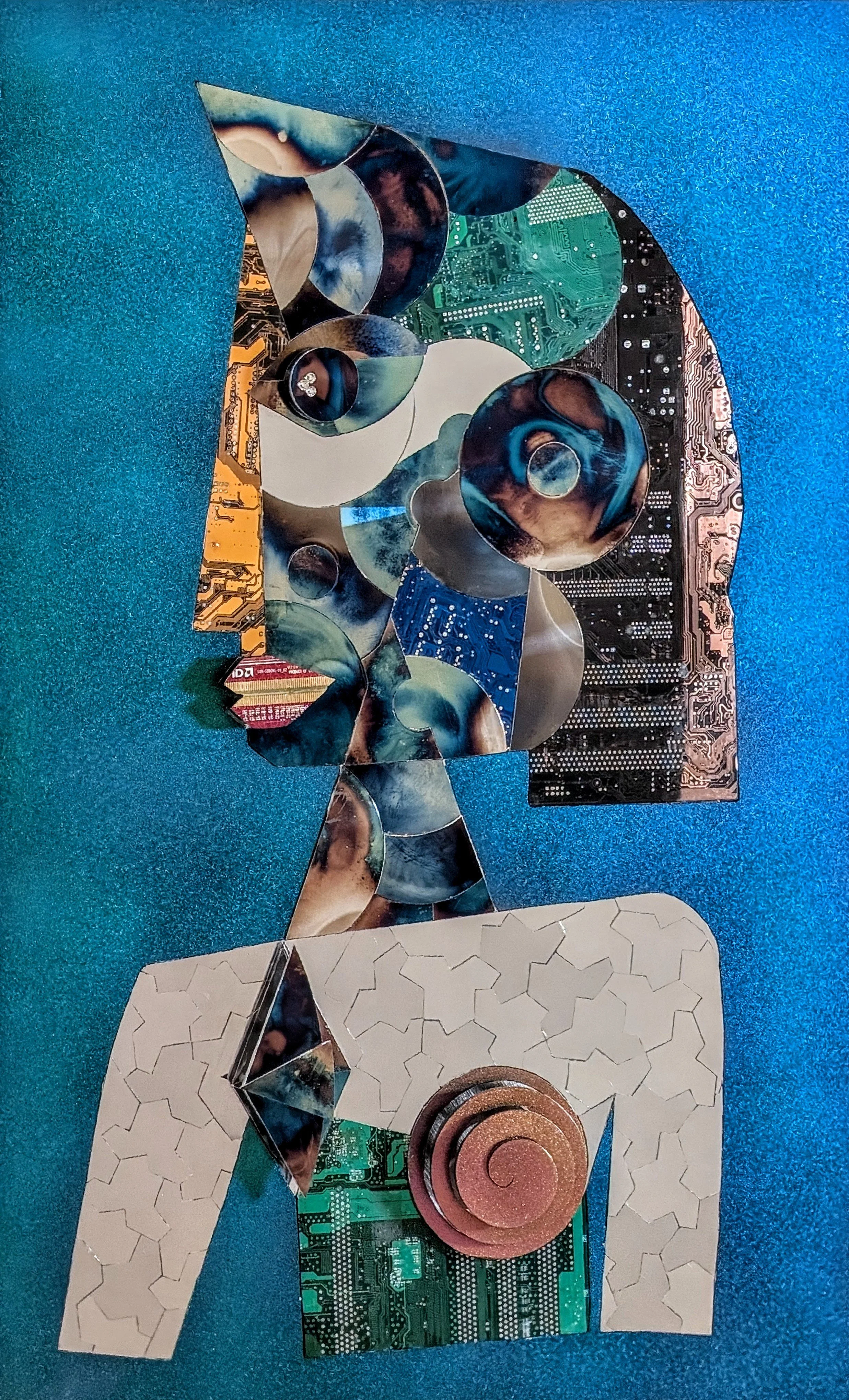 It uses e-waste, aluminum, and raised elements to achieve the Cubist goal of showing multiple perspectives at once. Automotive color-shifting paint and mirror-like platter pieces morph the art as the viewer moves, demanding interaction.