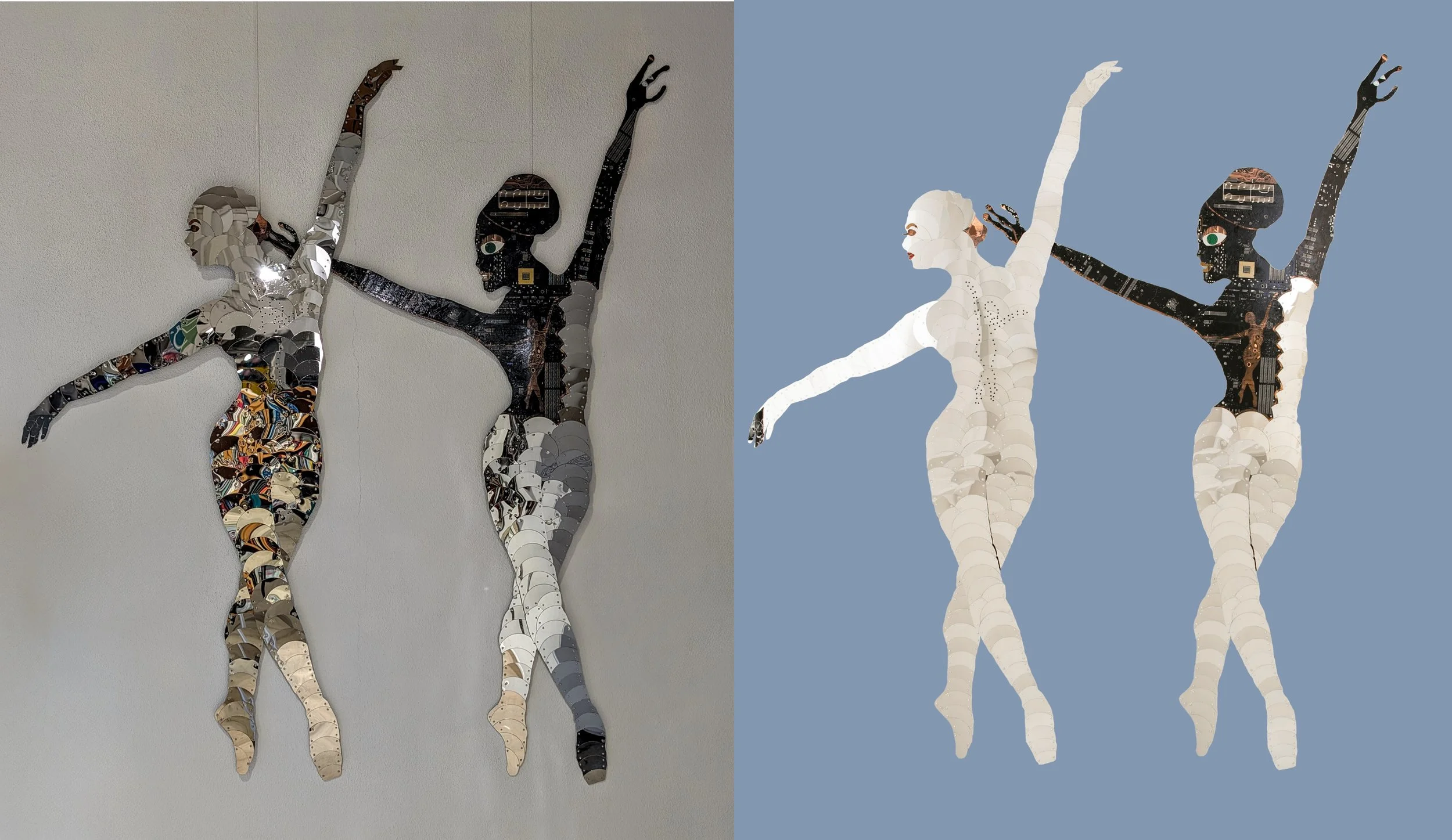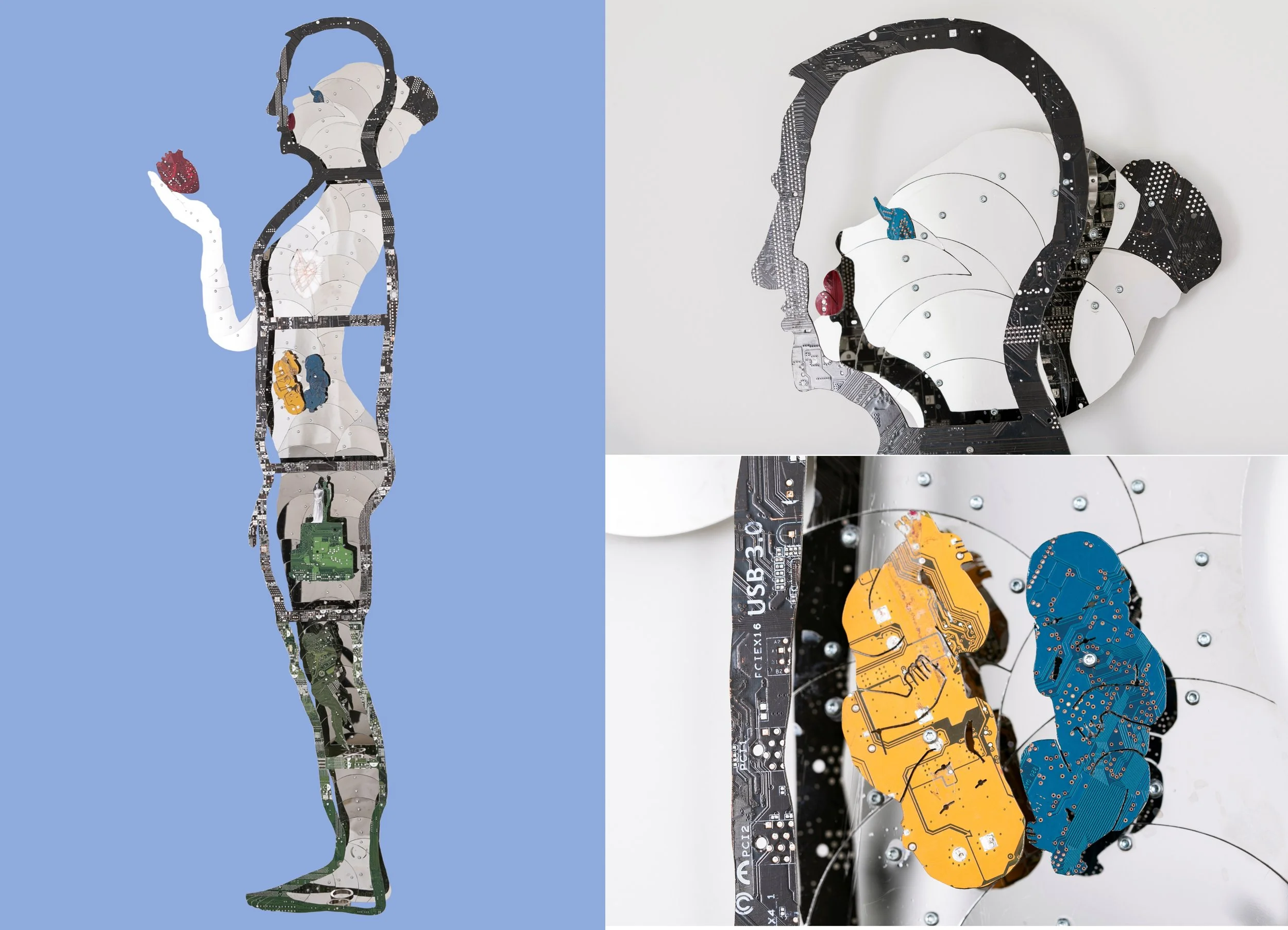 In my Connection series, I explore the nuances of human relationships by transforming upcycled computer components into reflective wall sculptures. Using hard drive platters and motherboards, I illustrate the intricate and sometimes messy bonds between people, depicting moments of love, dependence, and the search for boundaries.